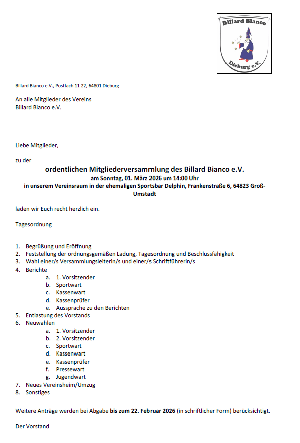 Einladung zur ordentlichen Mitgliederversammlung am 1.3.2026